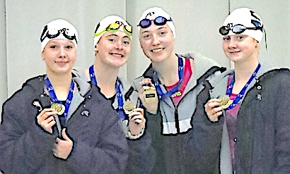 The Storm's winning 200 Medley Relay squad on the podiium. From left: Emily Melveney, Lizzi Fitzwater, Makenzie Fish and Aubrey Klemann.
