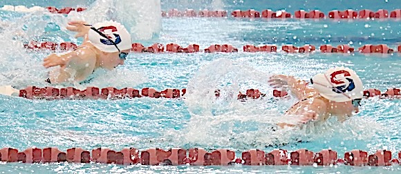 200 Medley Relay: 1st, Makenzie Fish, Lizzi Fitzwater, Emily Melveney and Lexi Emerson, 2:01.04, edging out Southern Cayuga's 2:01.09. The Storm also won the diving title, led by first-place finisher Saskia Dechow, who edged defending champion Casey Hines in the two-competitor field. However, the diving does not figure into the swim meet point totals. Finishing second for the Storm were Lexi Emerson in the 500 Free (5:36.08) and the 200 Free (2:08.36), and Emily Melveney in the 100 Fly (1:06.61). Lizzie Fitzwater placed fourth in the 100 Breaststroke. Photos in text: Top: The Storm's Makenzie Fish (foreground) passes Southern Cayuga's Colleen Whitten in the final 25 yards to win the 100 Back in a State Tournament qualifying time.
