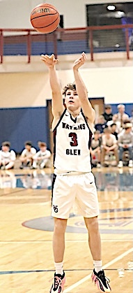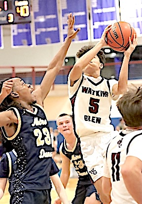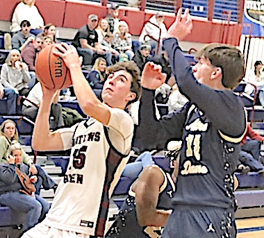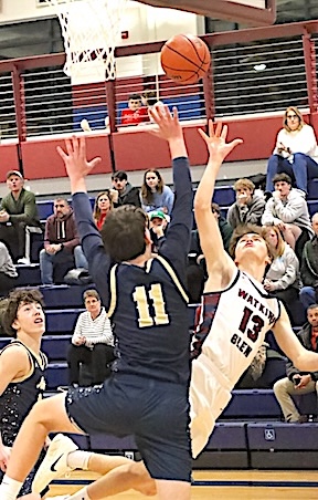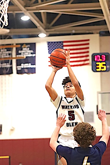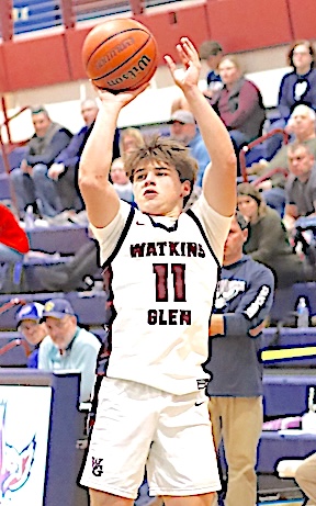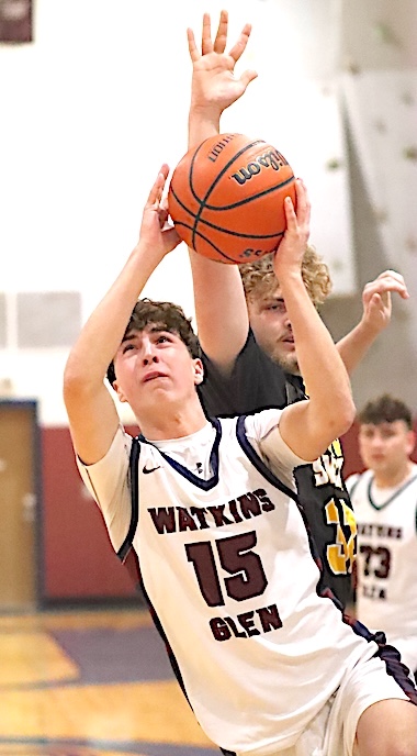 In the Consolation Game, South Seneca defeated Spencer-Van Etten, 74-33. Junior Varsity: Watkins Glen fell to Spencer-Van Etten 33-30 in the tourney's Junior Varsity Consolation Game. The Lake Hawks, now 0-6, rallied from a 32-18 deficit but could not quite overtake S-VE. Cooper Lagramada led Watkins with 17 points, while Noah Wright scored 6, Nicolai Holmes 5, and Dominik Thomson 2. Wright and Holmes each grabbed 10 rebounds. Marcus Whitman defeated Romulus for the JV title. Photos in text: Top: The Lake Hawks' Leon Lagramada takes aim at the basket.
