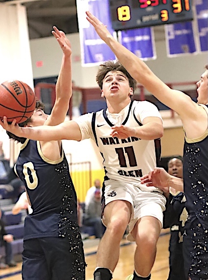 Junior Varsity: Watkins Glen fell to Romulus 39-30 in the opening round of the tourney's JV competition, and will play Sunday in the 12:00 noon Consolation Game against Spencer-Van Ettten. Romulus and Marcus Whitman will play for the JV title at 1:30. The Lake Hawks, now 0-5, were led by 11 points each from Noah Wright and Cooper Lagramada. Wright led in rebounds with 13, while Nicolai Holmes registered 6 points, 7 rebounds and 4 steals. Photos in text: Top: Watkins Gleen's Caleb Bresett drives to the basket in traffic.