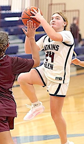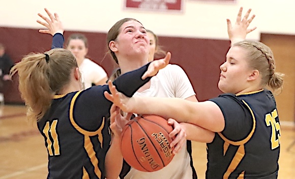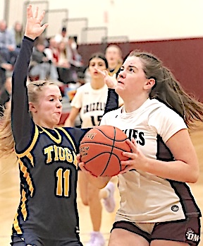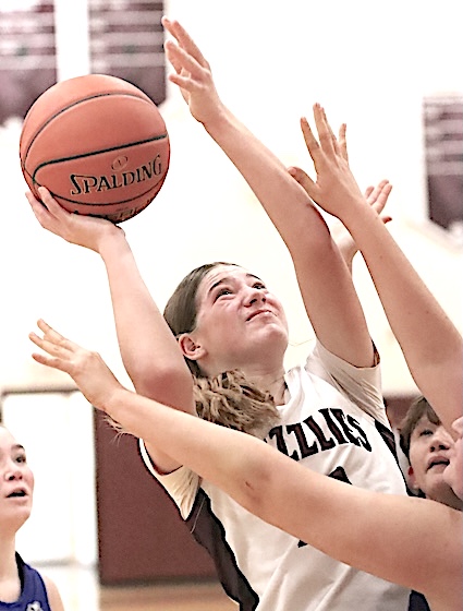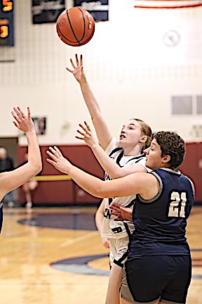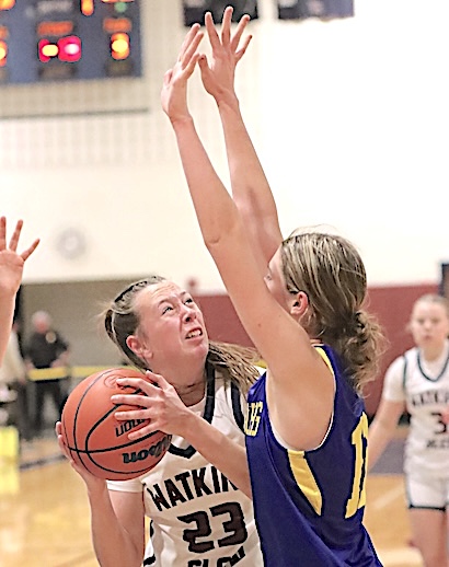 The Lake Hawks led 19-7 after one period, 36-14 at halftime, and 47-17 entering the fourth quarter. Michaela Wheaton and Olivia King led Watkins scorers with 13 points each, while Rachel Vickio scored 10, Emma Lewis 8, Lizzi Fitzwater 3, and Isabella Bellavigna, Grace Roney, Natalee Oliver and Zade Gomez Fitzsimmns 2 apiece. Oliver, King and Aubrey Klemann led in rebounds with 5 each, while Vickio and Bellavigna grabbed 4 apiece, and Wheaton, Fitzwater and Gomez Fitzsimmons 3 each. King led in steals with 5, Vickio in blocks with 2, and Oliver in assists with 5. Junior Varsity: Watkins Glen defeated Dryden, 45-35, to improve to 5-2. Allyson Oliver led Lake Hawks scorers with 12 points, while Keira Ells scored 10 and Amy Field 9. Photo in text: Watkins Glen's Olivia King prepares to shoot in traffic.