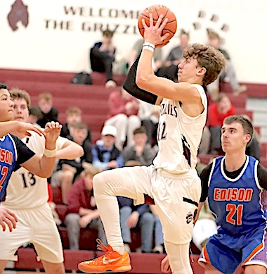 Left: O-M's Kayden Garrabrant shoots. Right: The Grizzlies' Moe Zinger maneuvers past an Edison defender. Odessa boys lose to Edison, slip to 0-4