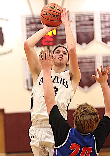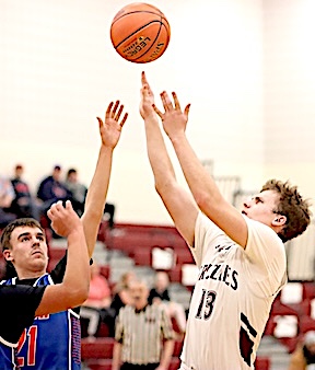 O-M missed a pair with 2:08 remaining, and then C-S sank a pair at 1:58 to go up 50-47. O-M missed two more at 1:49 before Campbell hit a 2-pointer to go up five, 52-47, at 1:26. Three more free throws increased the C-S lead to 55-47 by 46.2. From there, O-M hit 5-of-6 foul shots and Campbell 2-of-4 for a 57-52 score. A Moe Zinger 3-pointer at the buzzer left the Grizzlies short, 57-55. Mowry and Aaron Sutton led O-M scorers with 15 points each, while Kayden Garrabrant and Zinger had 7 each, James Halpin 6, Mason Dupay 3, and Connor Foggie 2. The team sank 13 of 29 free throws. Campbell-Savona was led by Dakota Ogden's 20 points, and 12 by Rece Jamison. Their team sank 19 of 32 free throws. Odessa-Montour returns to action Tuesday night at home against Candor. Junior Varsity: Odessa-Montour defeated Campbell-Savona, 43-32. Mason Smith led the Grizzlies with 16 points, while Ethan Dupay scored 10 and Jeremy Updyke 8. Photos in text: O-M's Moe Zinger (top) and James Halpin (bottom) take aim.