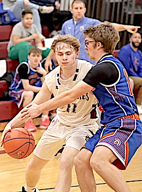 Left: O-M's Aaron Sutton tries to work his way past an Edison player. Right: In the JV game, Jeremy Updyke goes up for a shot. He scored 15 points.