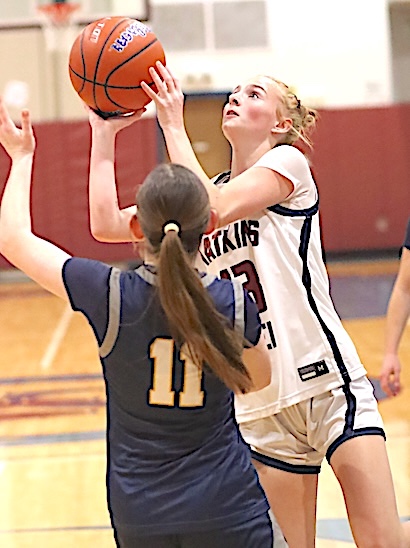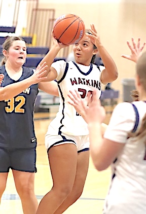 Left: Watkins' Isabella Bellavigna shoots. Right: In the JV game, Keira Ells takes aim.