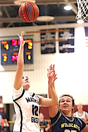 Left: Watkins Glen's Michaela Wheaton shoots. Right: In the JV game, Michaela's sister McKenzie Wheaton puts up a shot.