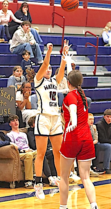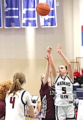 Varsity Consolation Game: Lyons defeated Marcus Whitman, 78-46. Junior Varsity: Watkins Glen defeated Lyons in the consolation game, 51-26. Allyson Oliver led the Lake Hawks with 15 points, while McKenzie Wheaton scored 11, Amelie Woods 10, and Keira Ells 8. About the tournament: The Melissa B. Wilson Tournament is in memory of a WGHS graduate and basketball player. Her family has been involved in the tournament for many years, and could be found running the concession stand on tournament days. Photos in text: Top: Watkins Glen's Rachel Vickio sends the 3-point shot that put the Lake Hawks ahead for good in the final minute. She later sank two free throws. Bottom: The Lake Hawks' Natalee Oliver drives to the basket.